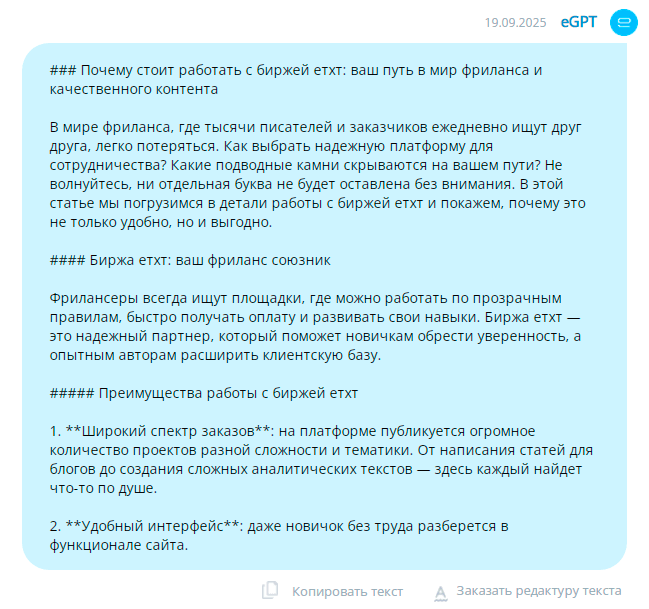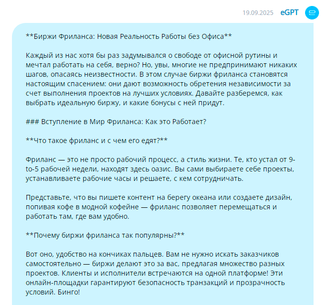 eGPT создает контент на различные темы и экономит время, но сдавать необработанную сгенерированную статью нельзя!